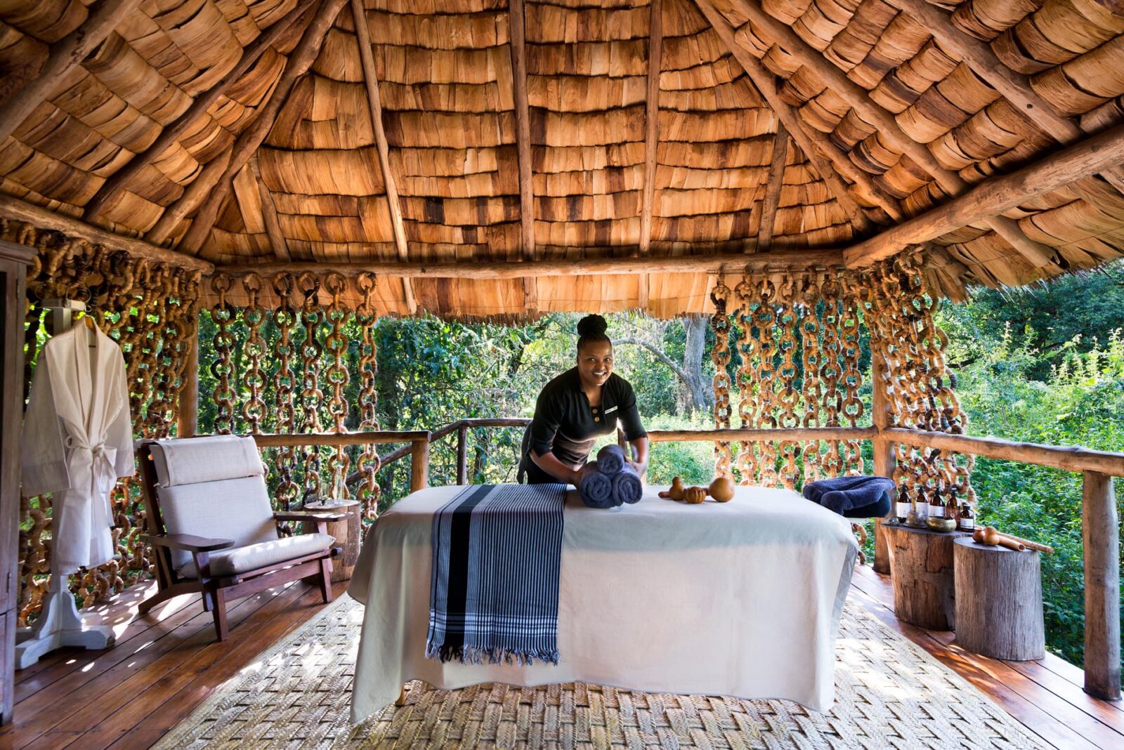 Die Lodge ruht wie ein verborgenes Baumdorf inmitten alter Mahagonibäume. Jede der 9 stilted Treehouse Suiten wurde aus lokalen Materialien wie Holz und Makuti Palmblättern gebaut und schwebt leicht erhöht über dem Waldboden. Der Stil verbindet natürliches Tansania mit zeitgemäßem Komfort. Große Fensterfronten und weite Holzdecks holen den Wald nach innen. Ein freistehendes Bad mit Blick ins Grün und eine Außendusche unter afrikanischem Himmel machen den Aufenthalt sinnlich persönlich. Jede Suite verfügt über Ventilator, Moskitonetz, private Bar, WLAN, Safe und viel Raum für Privatsphäre. Die exklusive Family Treehouse Suite bietet zwei eigenständige Schlafzimmer mit eigenem Bad und eignet sich ideal für Familien mit zwei Erwachsenen und zwei Kindern. Insgesamt beherbergt die Lodge höchstens 20 Gäste, was die intime Atmosphäre bewahrt. Im Hauptbereich erwarten Sie Lounge, Bar, interaktive Küche und ein traditionelles Boma für Dinner unter dem Sternenhimmel. Ein kleiner Pool im Wald schenkt Erfrischung nach der Pirsch, und eine Massage im Healing Earth Spa Sala bringt Ruhe nach einem Tag voller Eindrücke.