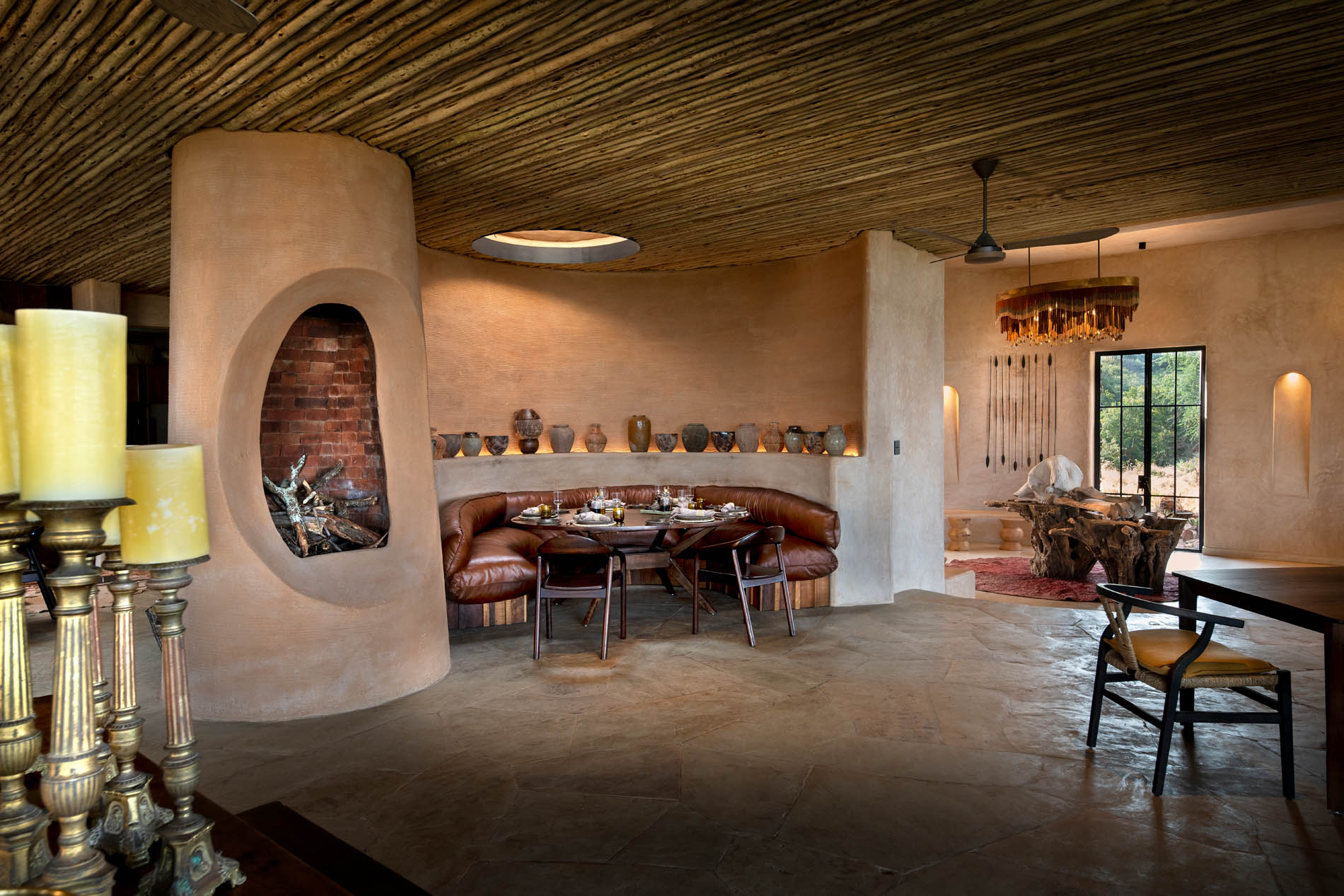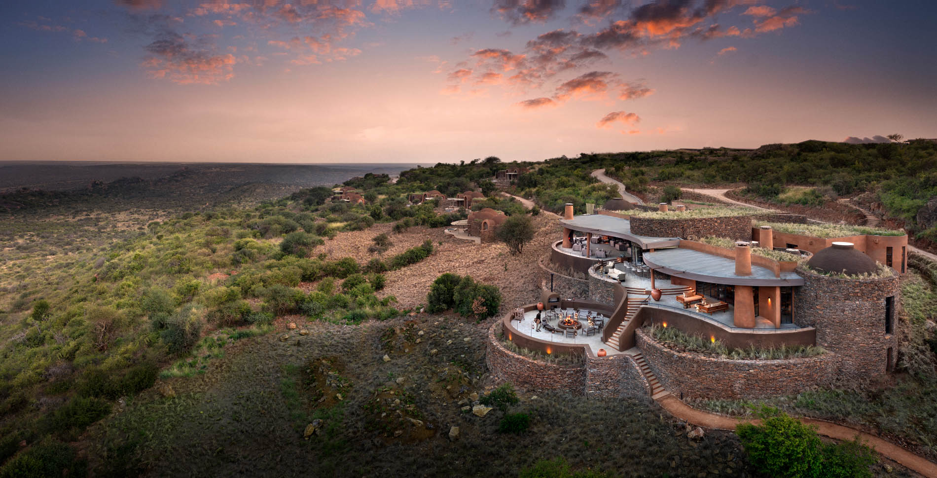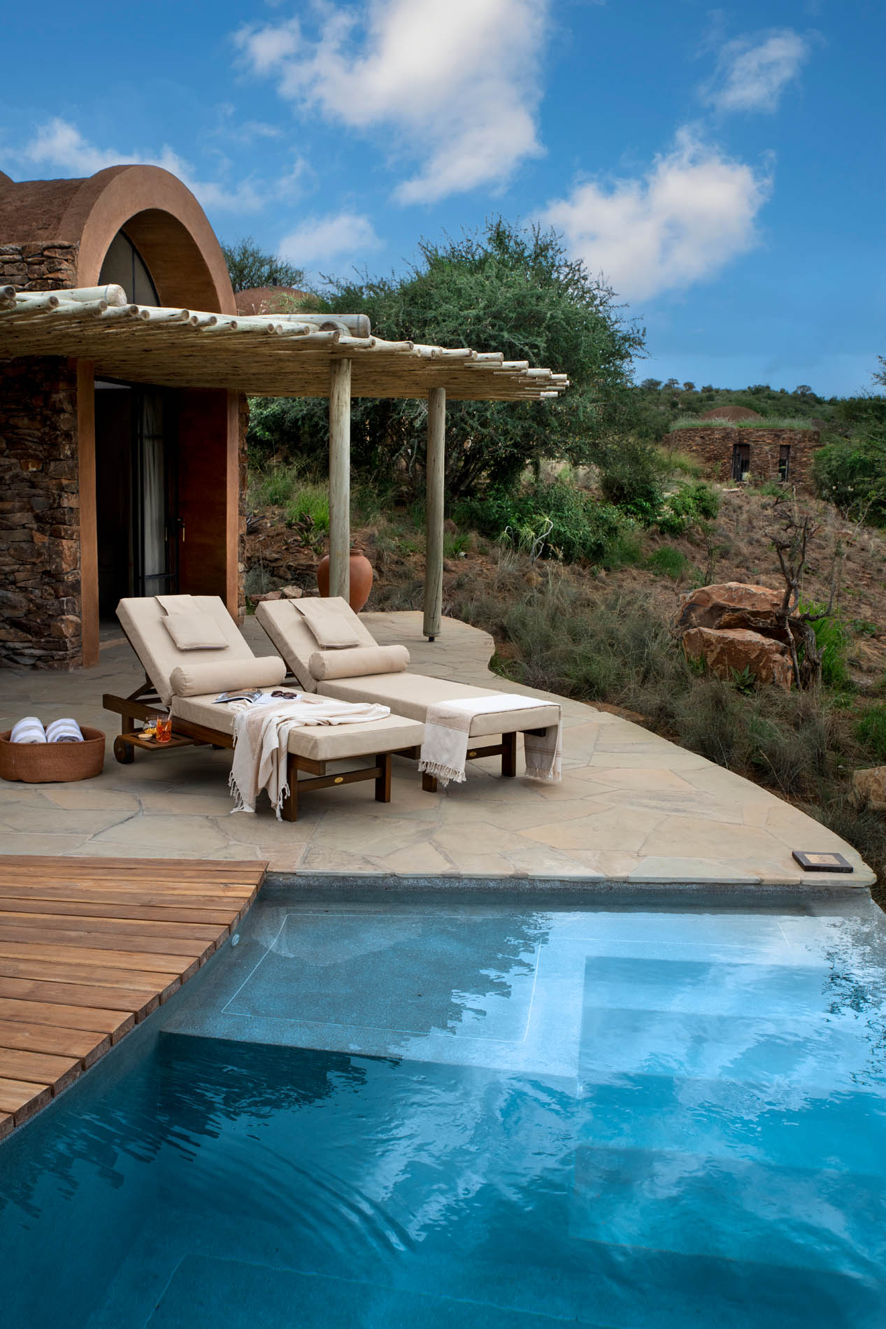 Inspiriert von den Granit-Kopjes folgt die Architektur sanften Kurven und verschmilzt mit Vegetation und Stein. Das Interior lebt den Afro Wabi Sabi Gedanken, kleine kulturelle Details aus dem Leben der halbnomadischen Gemeinschaften verleihen Tiefe. Die Lodge bietet 14 Suiten für maximal 31 Gäste, darunter eine Family Suite und eine Triple Suite. Jede Suite verfügt über Schlafzimmer, Lounge, privates Deck mit Rim-Flow Plunge Pool, Innen und Außendusche, Kamin und Daybed. WLAN, Safe, persönliche Bar und eine Kaffee-Station sind selbstverständlich. Familien finden in der Family Suite ein zweites Schlafzimmer mit eigenem Bad und ebenfalls privaten Pool. Im Hauptbereich warten Samburu Bar, Bibliothek, Map Room, Innenhof mit offenem Kochfeuer, Pool mit Aussicht sowie ein interaktiver Speisebereich.