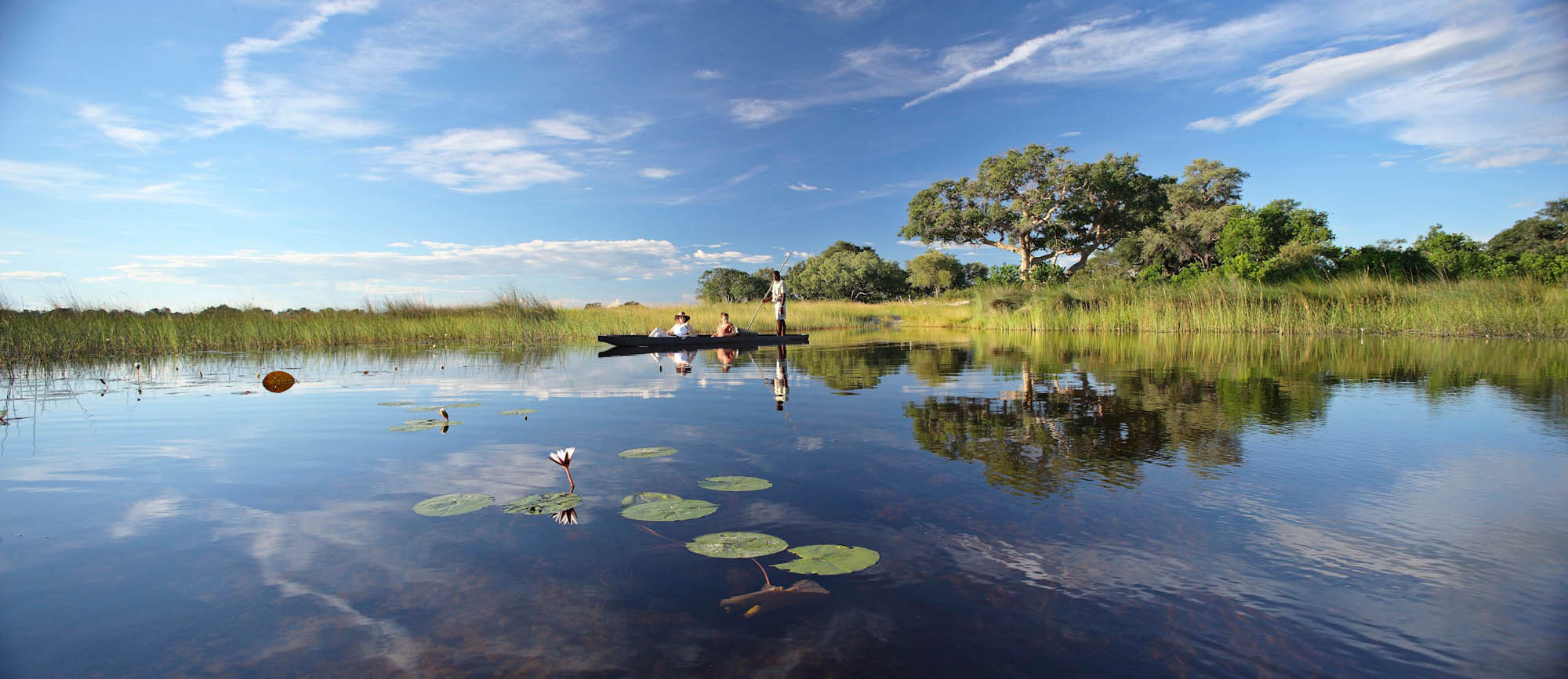 Je nach Wasserstand eröffnen sich saisonale Wasseraktivitäten – lautlos gleiten Sie im Mokoro durch Papyruskanäle, kommen Vögeln und Flusspferden so nah wie nirgends sonst oder erkunden das Delta per Motorboot, um neue Perspektiven auf diese schwimmende Welt zu gewinnen.