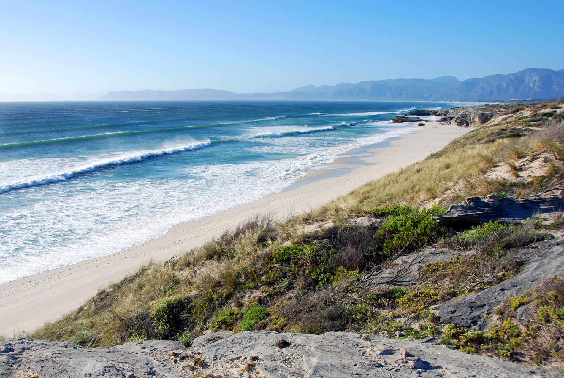 Grootbos thront über einer unberührten Küstenlinie mit einem Netz uralter Klipgat-Höhlen, in denen schon vor rund 80.000 Jahren Menschen lebten. Heute blicken Sie von den Hügeln über die Bucht, in der sich das Marine Big 5 Spektakel zeigt, mit Walen, Haien, Pinguinen, Seehunden und Delfinen. Bis Hermanus sind es etwa 50 Kilometer. Die Stimmung ist still, salzig, weit. Sie spüren die Kraft der Elemente und das sanfte Licht der Südküste.
