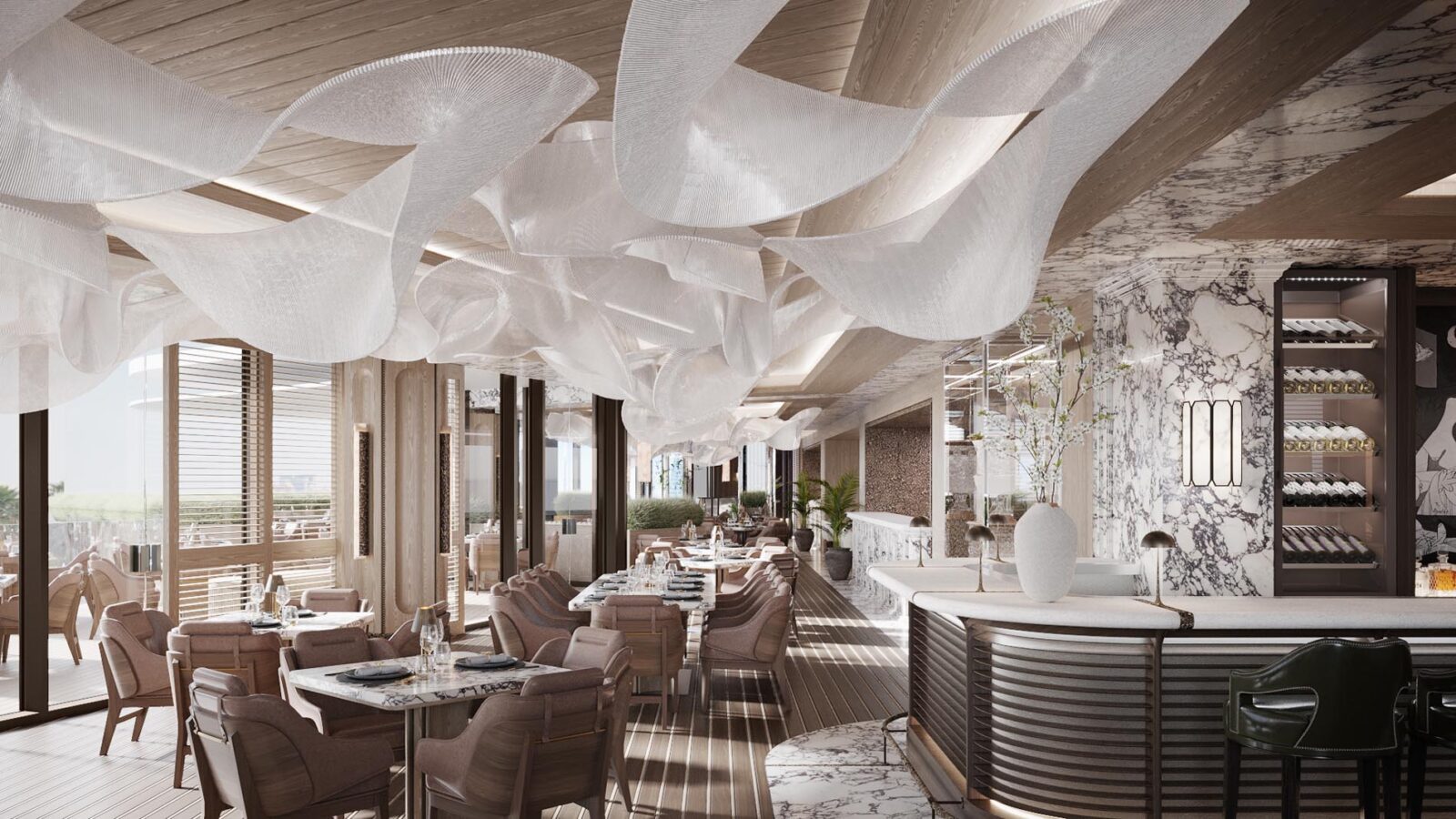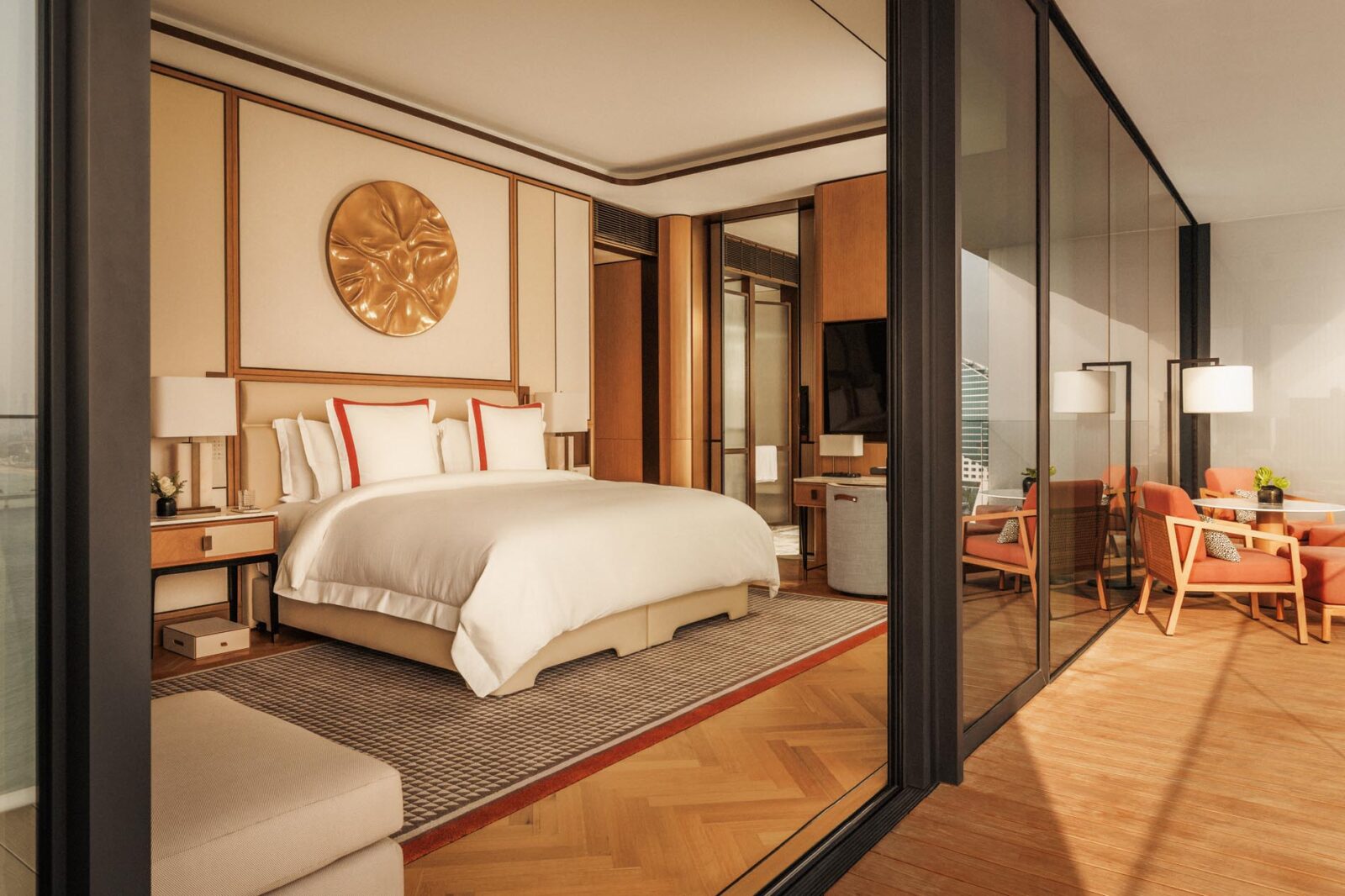 Die Gestaltung der Suiten nimmt subtil Bezug auf ikonische Motoryachten wie die Riva Boote Italiens. Warme Hölzer, elegante Lederdetails und klare Linien sorgen für sportive Eleganz. Die großzügigen Wohnbereiche sind geschaffen für längere Aufenthalte. Wenn Sie morgens aufwachen, öffnet sich Ihre Terrasse zur See und der Tag beginnt mit Licht.