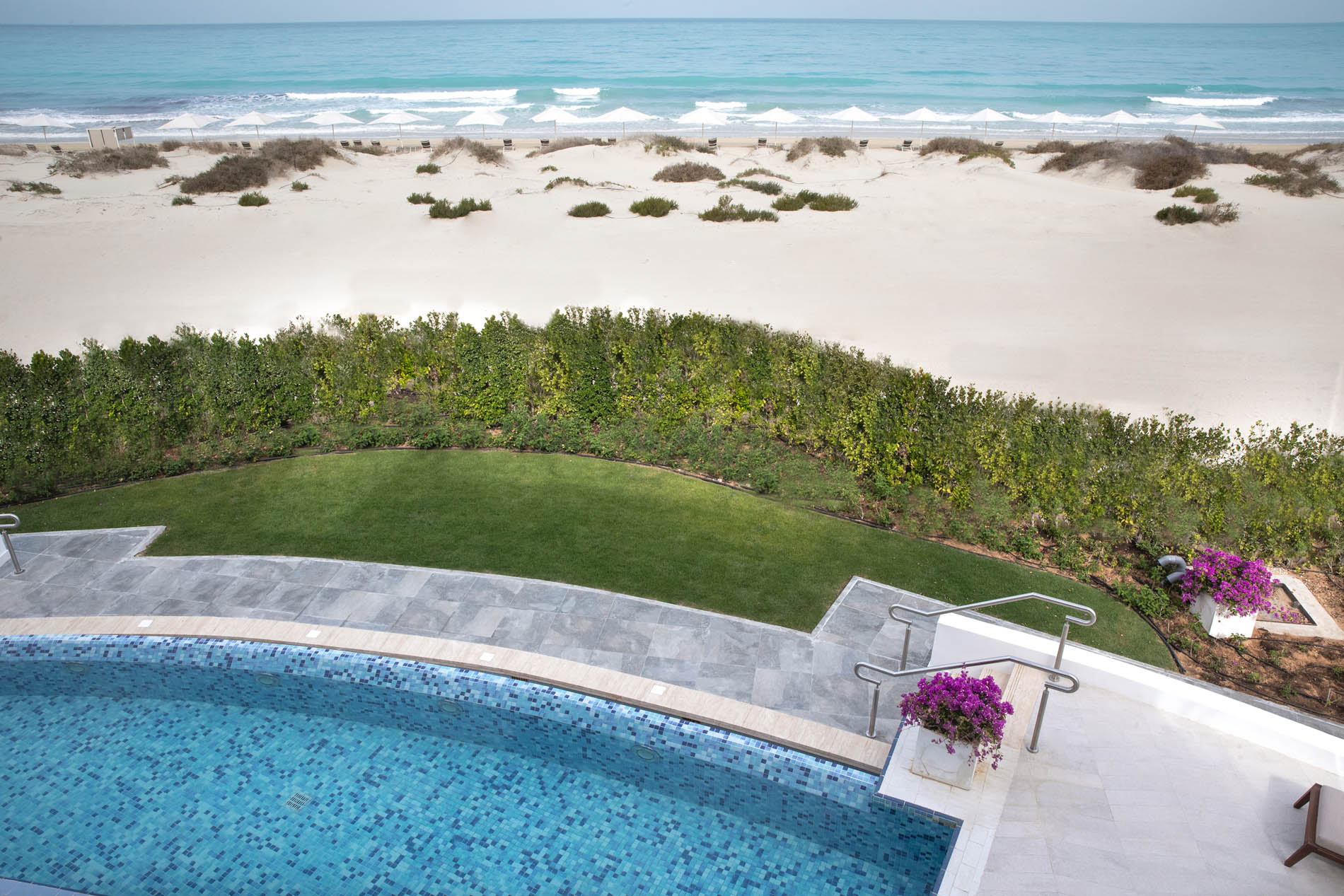 Die Architektur des Jumeirah Saadiyat Island folgt einer klaren Idee: Die Natur steht im Mittelpunkt. Die Gebäudeform wirkt organisch – das Haupthaus ist in einer weichen Ellipse angelegt, von der einzelne Flügel wie natürliche Ausläufer in Richtung Strand wachsen. Diese Linienführung, entwickelt von DBI, schafft das Gefühl, dass die Anlage Teil der Umgebung ist statt ein Fremdkörper in der Landschaft. Alle Suiten orientieren sich nach Norden, um den Blick aufs Meer zu maximieren und direkte Sonneneinstrahlung zu reduzieren. So wird das Klima genutzt, statt dagegen anzukämpfen.