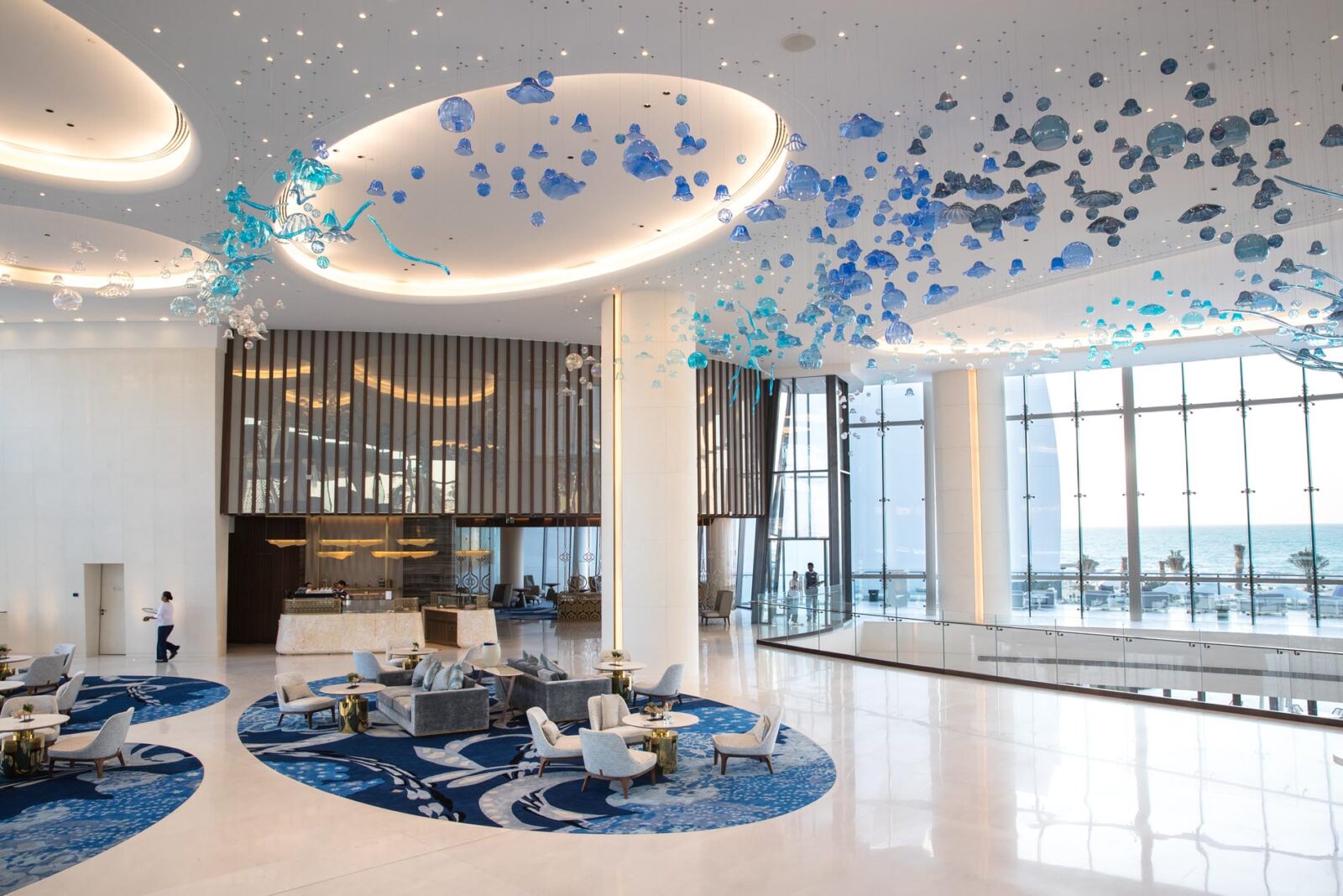 Im offenen Lobbybereich führt der erste Blick direkt hinaus aufs Meer: freie Sichtachsen, viel Tageslicht, helle Oberflächen. Ein Hingucker ist der rund 2.000 Kilogramm schwere, mundgeblasene böhmische Kristallleuchter, der aus über hundert Einzelteilen besteht. Die schimmernden Elemente erinnern an Meeresleben in Opal- und Azurtönen und greifen die maritime Umgebung auf.