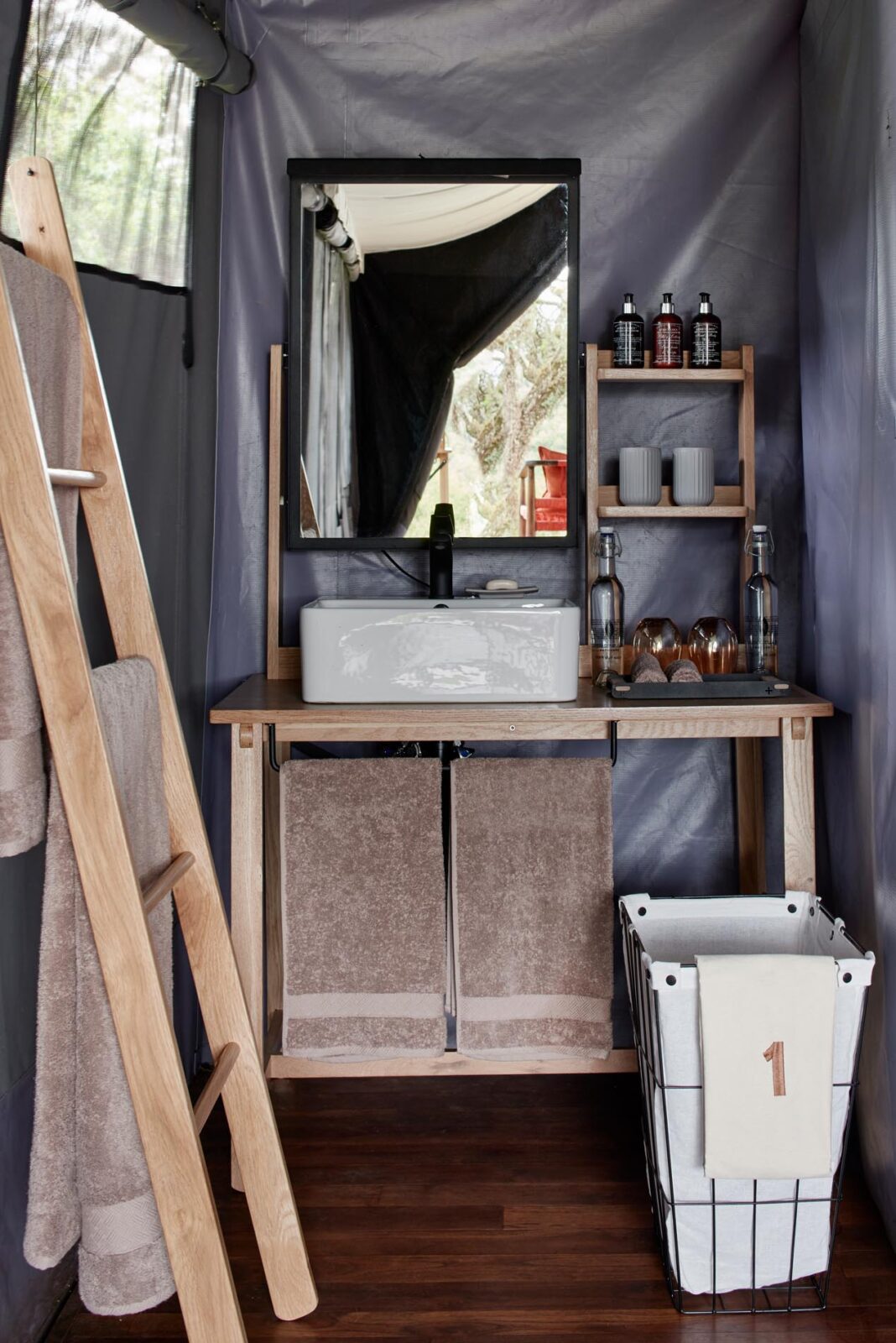 Im Ensuite Badezimmer finden sich Dusche, WC, Waschbecken, Föhn und Pflegeprodukte. Für kühle Abende sorgen Gasheizungen und warme Decken. Nachhaltige Materialien, Teakholz und Canvas schaffen ein natürliches Ambiente, das perfekt in die Umgebung passt.