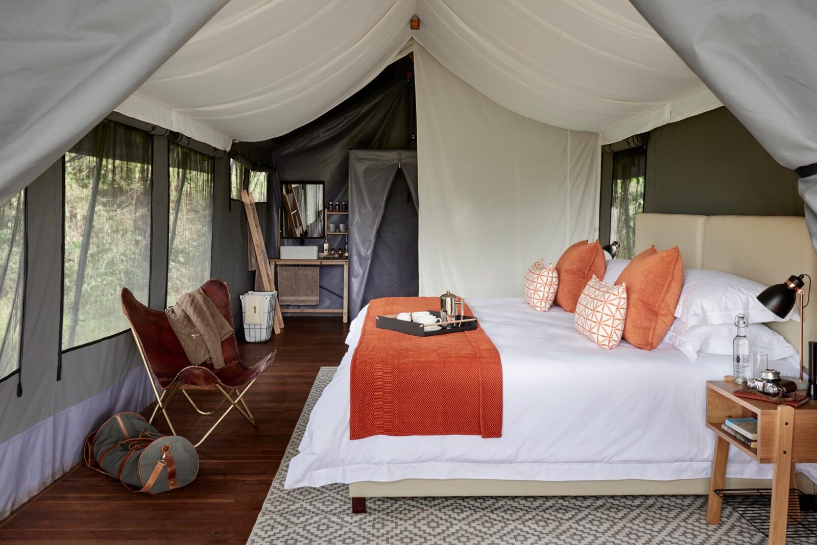 Das Camp besteht aus zehn luxuriösen Gästezelten, die den Charme klassischer Safaris mit modernem Komfort verbinden. Jedes Zelt bietet rund 42 Quadratmeter Wohnfläche mit Kingsize Bett, feiner Bettwäsche, einem Schreibtisch, einer Garderobe und einer privaten Terrasse mit Blick auf die Hochländer.