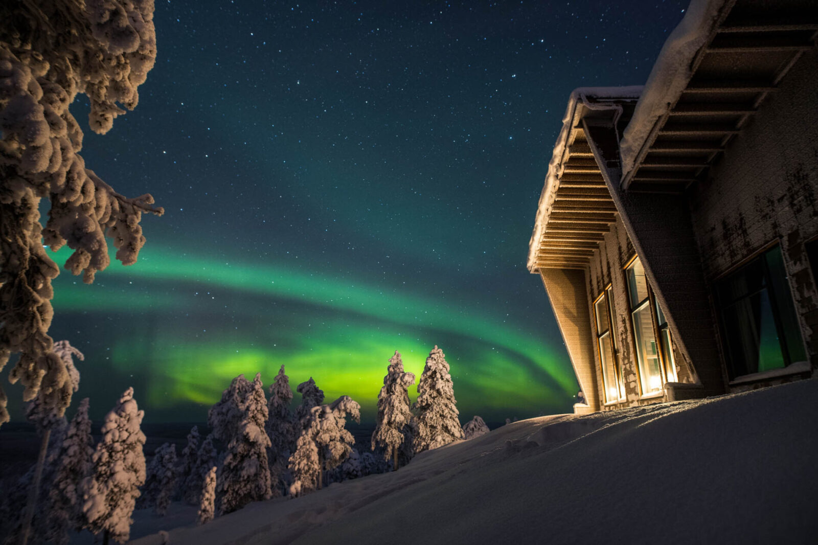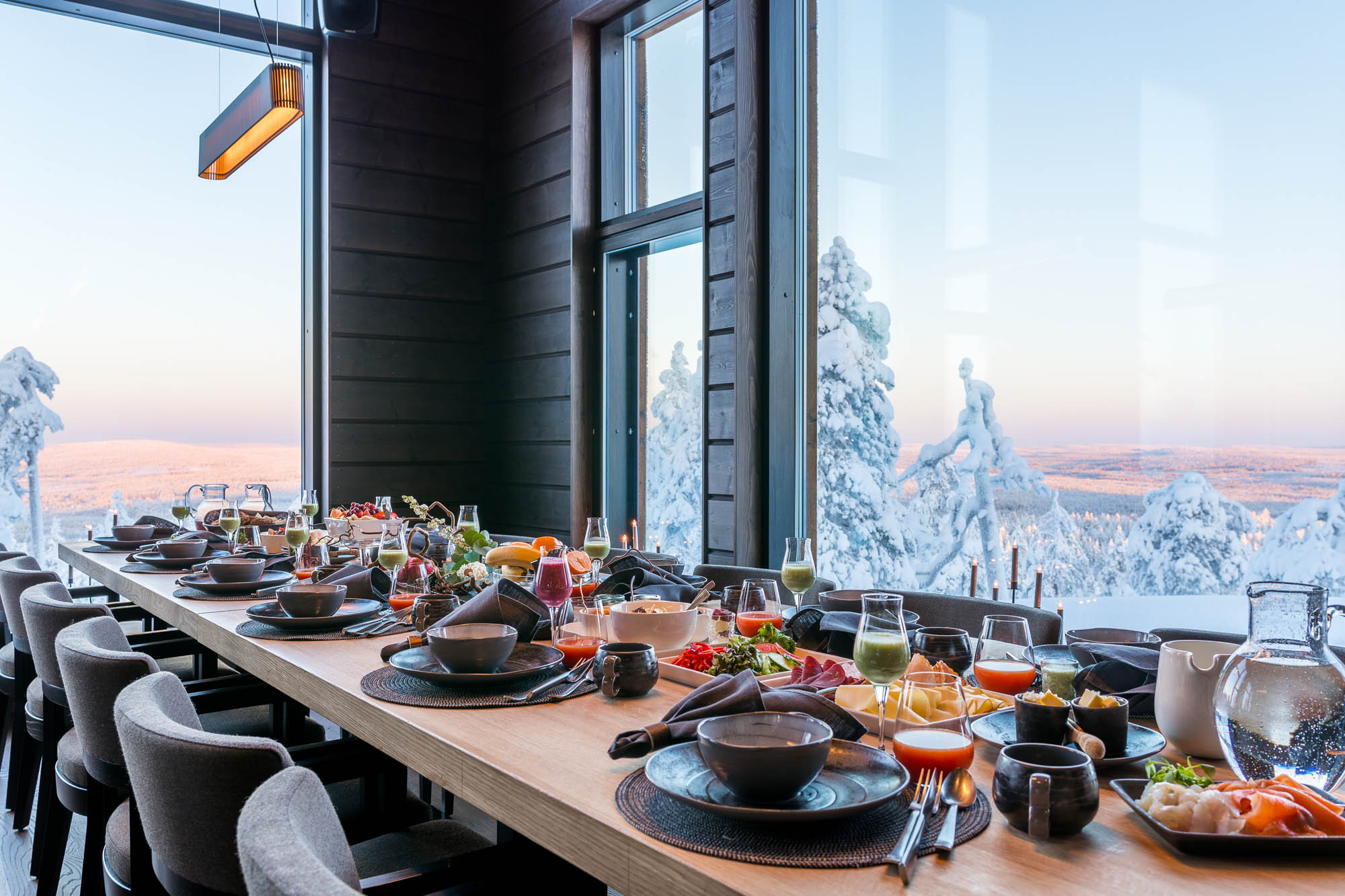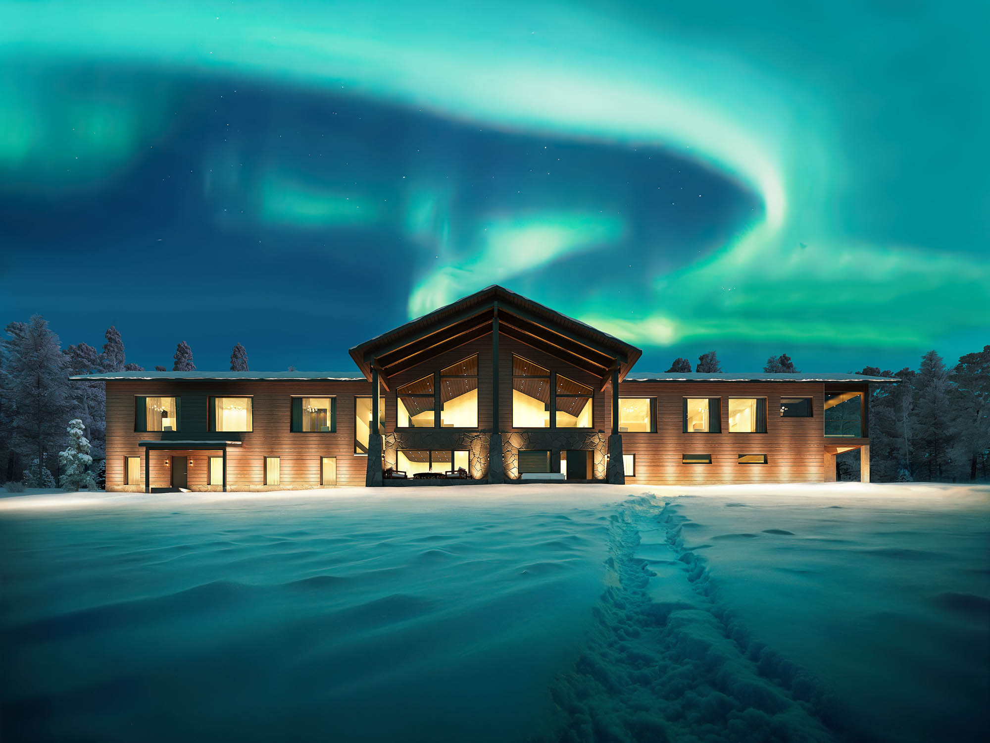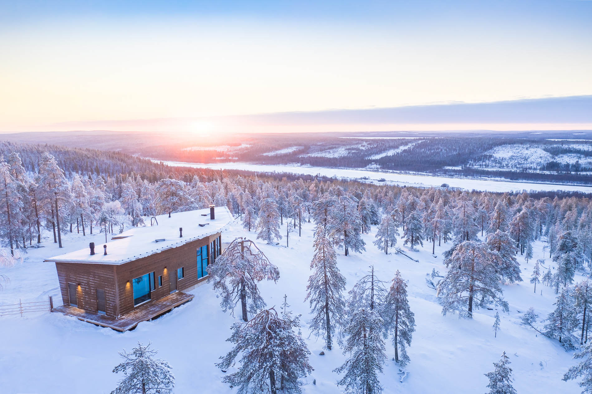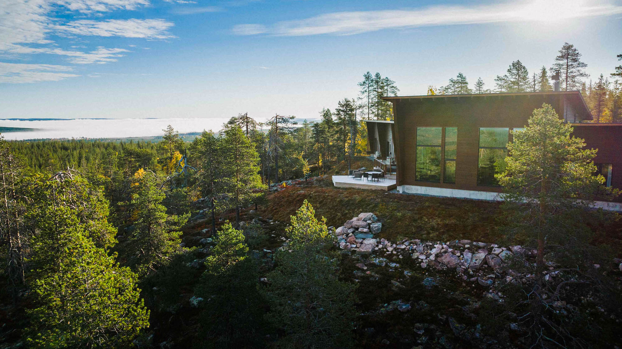 Die Holz-Lodge ist ein rustikales Blockhaus mit warmen Naturmaterialien und zeitgemäßem Komfort. Insgesamt gibt es zehn Zimmer. Die Lodge kann für exklusive Übernachtungen von geschlossenen Gruppen gebucht werden. Ergänzend stehen eine Two-Bedroom Villa sowie ein Glasiglu zur Wahl. Ein professionelles Team kümmert sich rund um die Uhr um alle Wünsche. Ihr privater Wildnisführer plant die Tage, der Koch serviert regional inspirierte Menüs und der Butler organisiert reibungslose Abläufe. Außergewöhnliche Saunen sind in die Landschaft eingebettet und machen das Ankommen leicht.