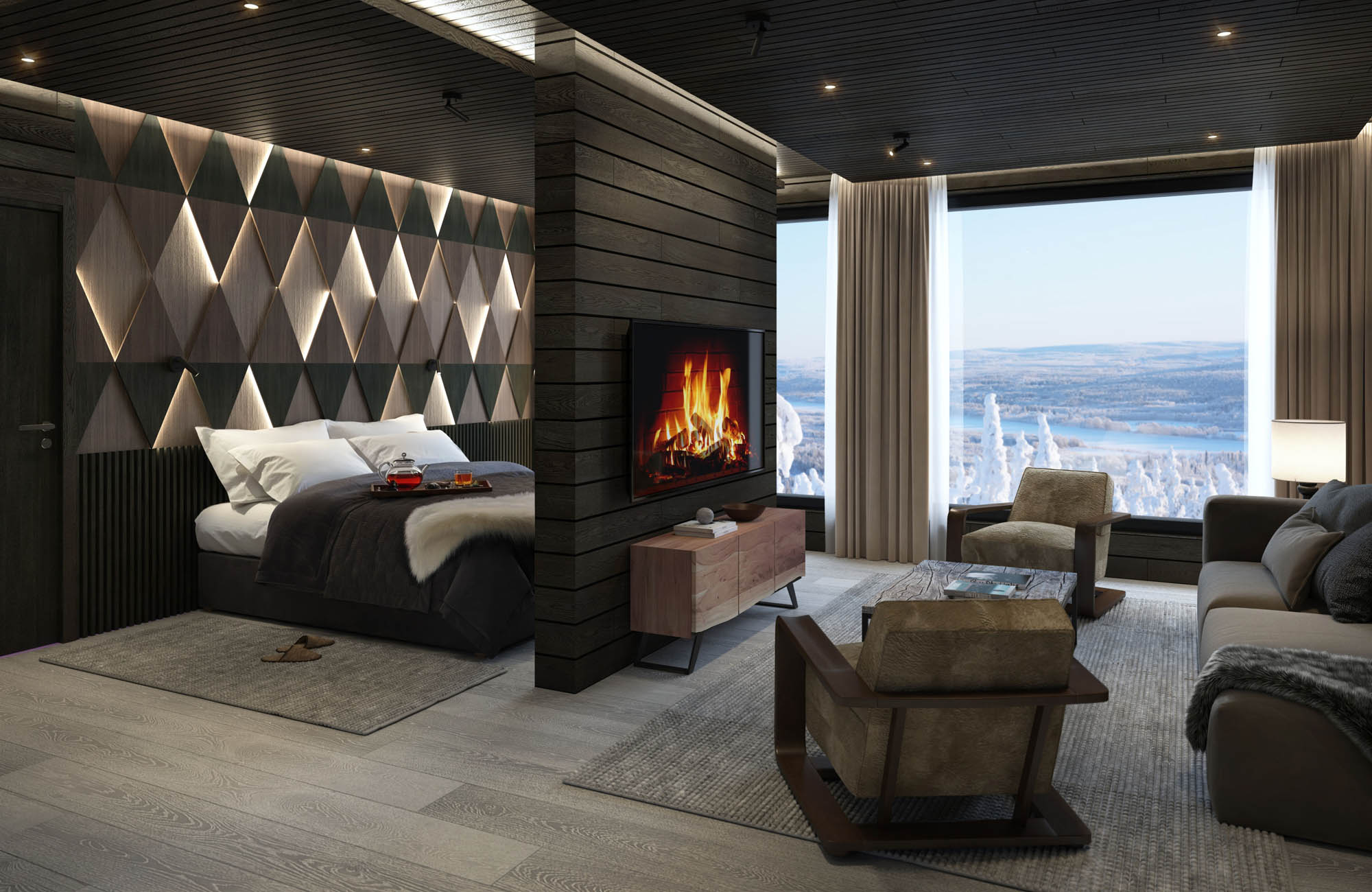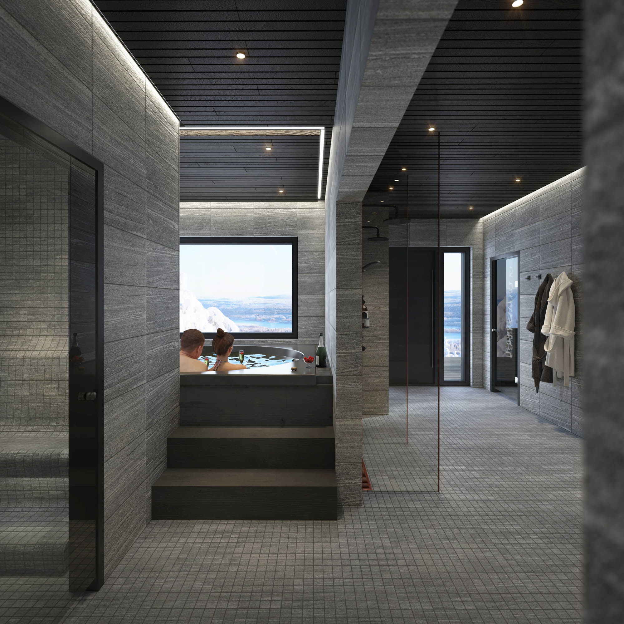Drei Saunen, eine traditionelle finnische Sauna, eine Dampfsauna und eine Infrarotkabine sowie indoor und outdoor Jacuzzis schenken Entspannung nach Tagen in der Kälte. Eine Lounge mit Kamin, ein privates Speisezimmer, ein Cigar Room und eine Bar vollenden das Bild eines Hauses, das für Rückzug, Genuss und Gemeinschaft geschaffen ist.