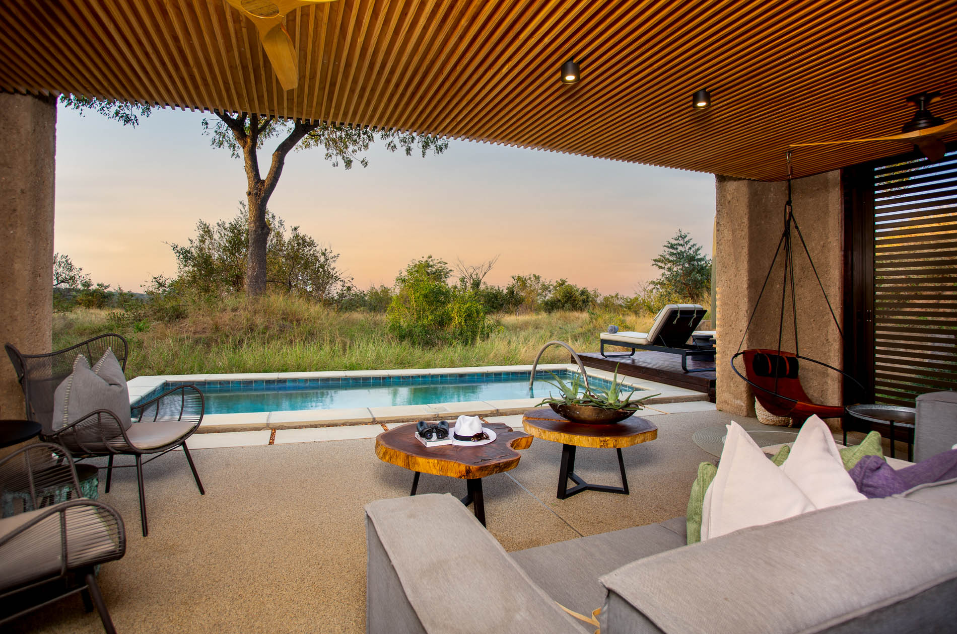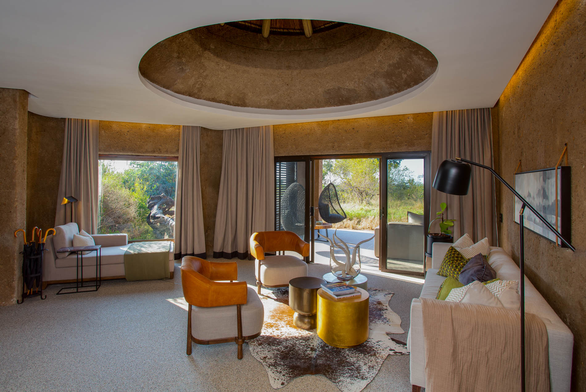 Die Earth Lodge ist ein Meisterwerk der Nachhaltigkeit und Ästhetik. In die Erde modelliert, fügt sie sich nahezu unsichtbar in die Buschlandschaft ein. Wer den versteckten Eingang durchschreitet, steht plötzlich vor einer Szenerie aus warmem Licht, klaren Linien und unendlichem Blick.