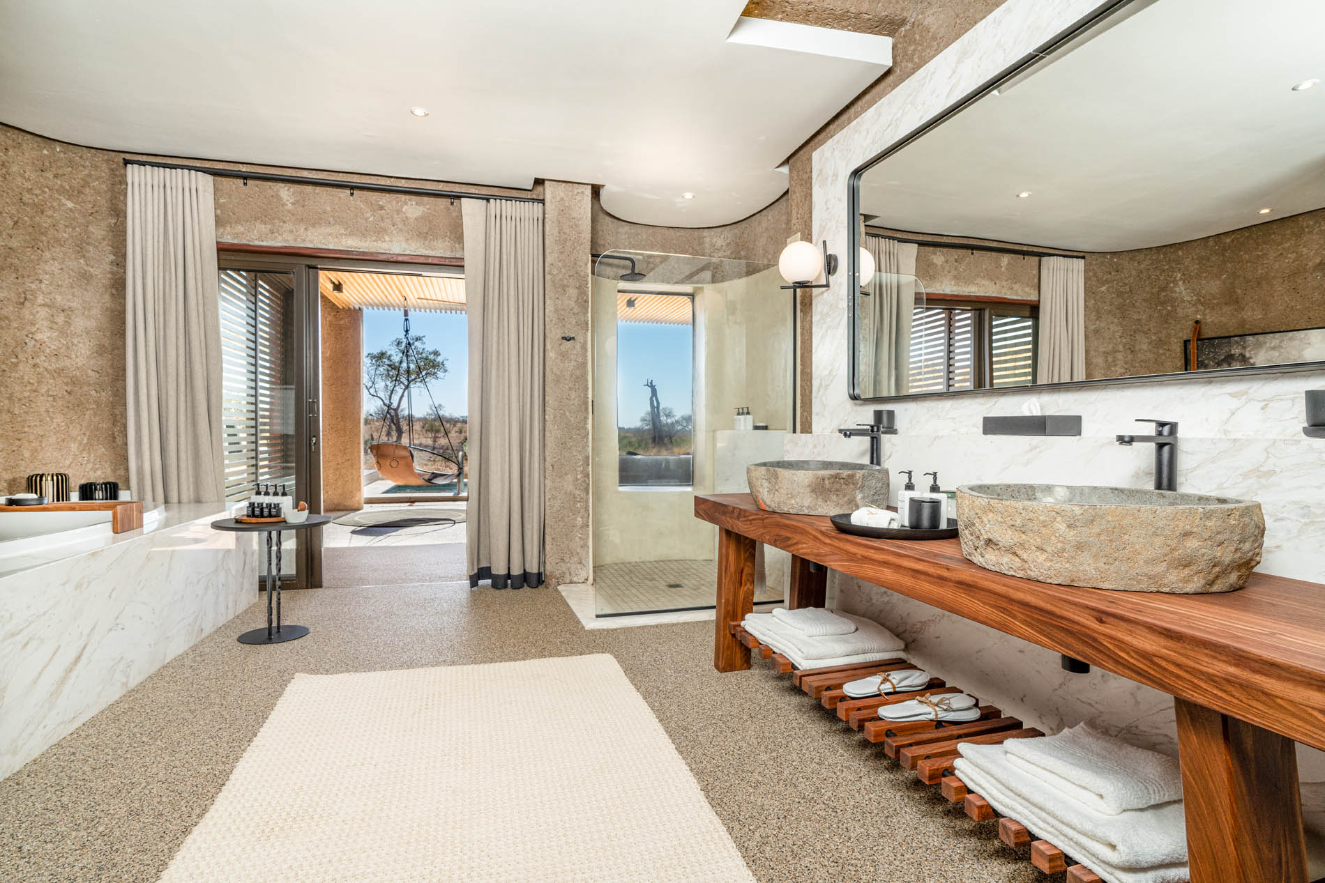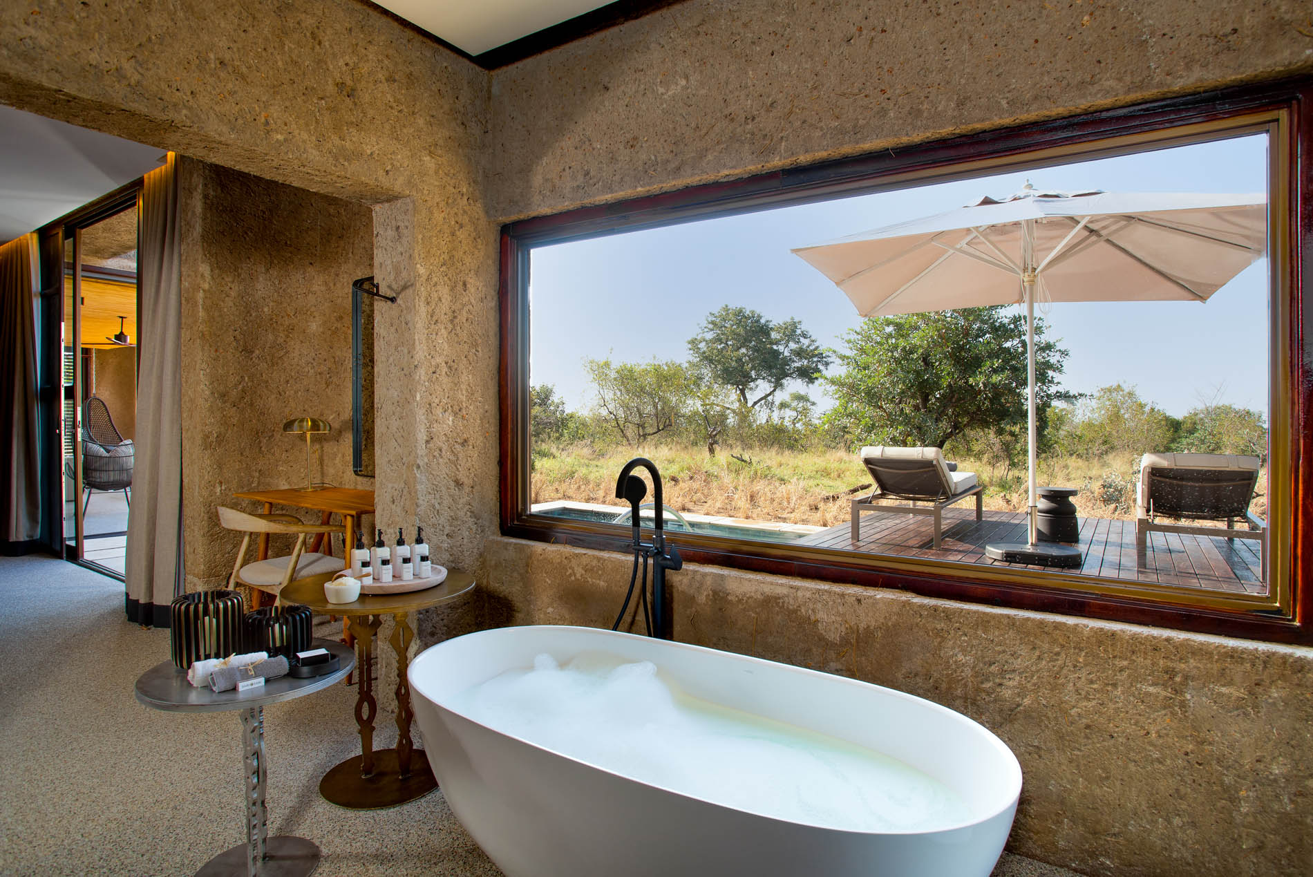 Die öffentlichen Bereiche holen das Draußen nach innen mit Glas, Stein und Wasser, die den Busch widerspiegeln. Der unterirdische Weinkeller birgt die besten südafrikanischen Jahrgänge, während die Day Bar mit weißen Salas und Tischen im flachen Pool zu endlosen Nachmittagen einlädt. Abends lodert das Feuer im Boma, und die Amani Spa Lodge schenkt Ihnen Stille und Erholung. Es ist ein Ort, an dem Körper und Seele neu ankommen dürfen.