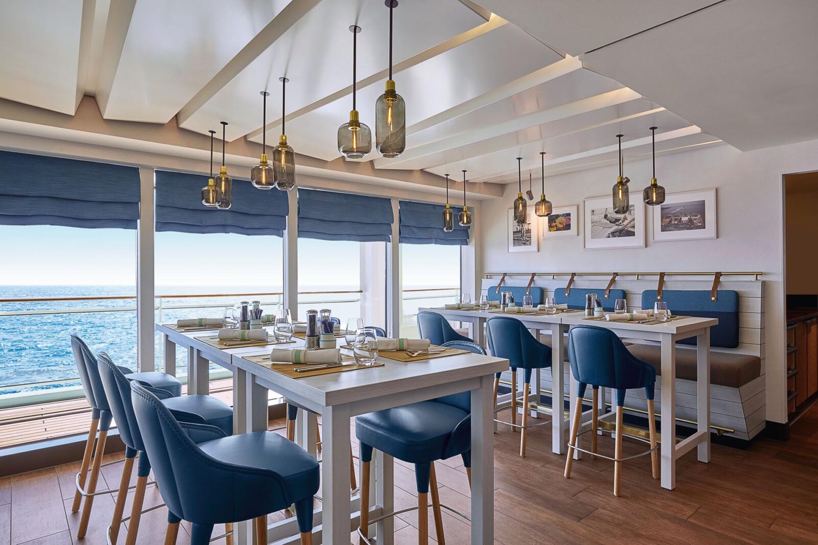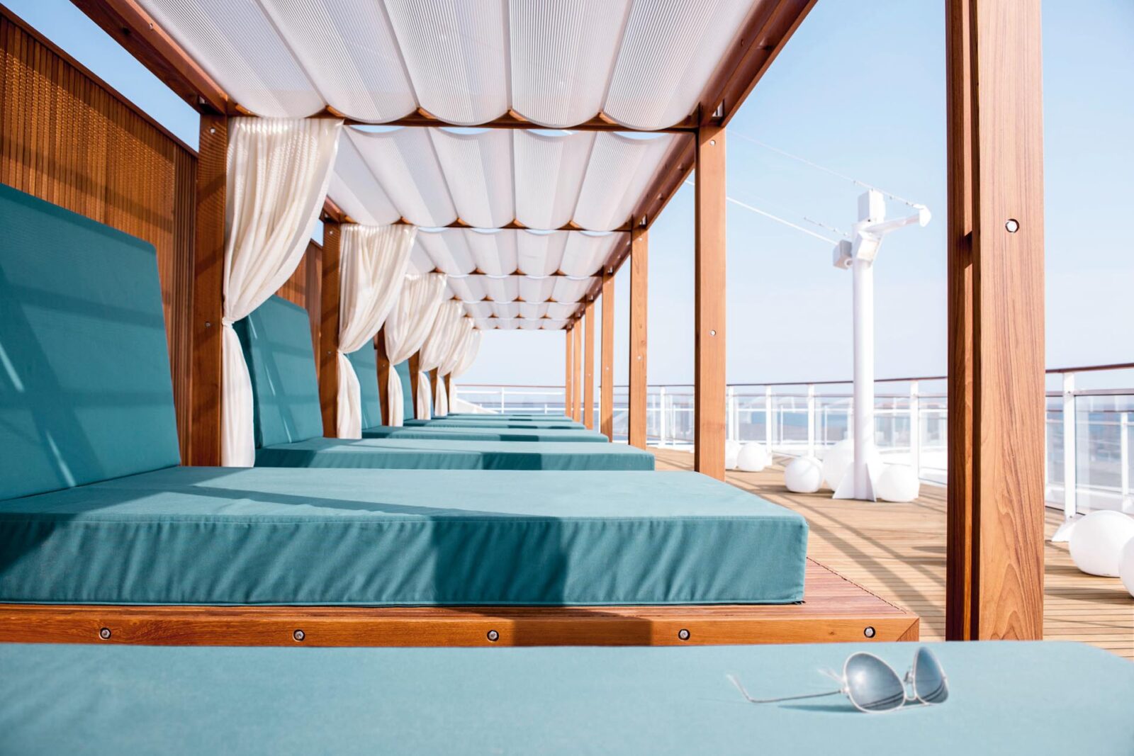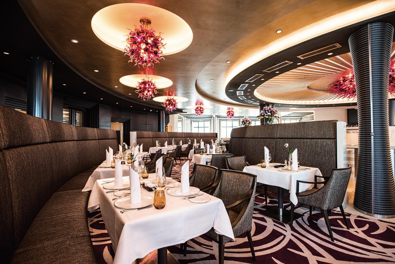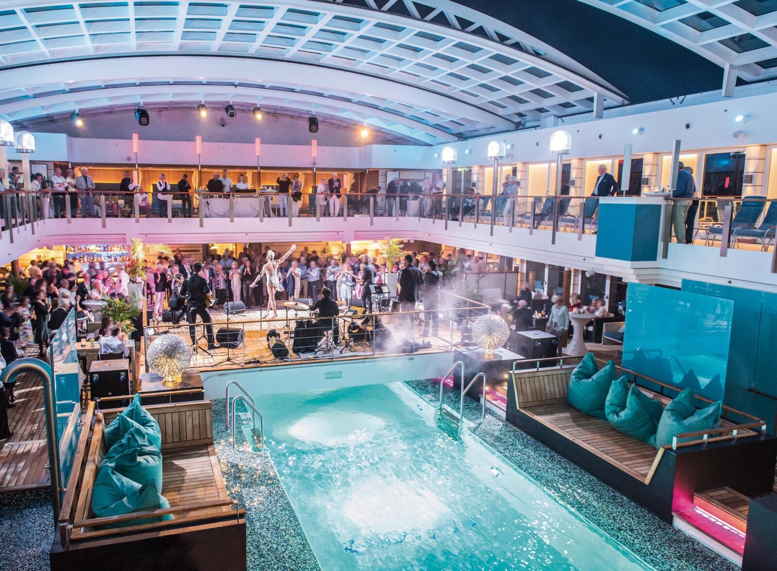 Das Herzstück ist das Atrium, ein mehrstöckiger, lichtdurchfluteter Raum mit gläsernen Aufzügen, skulpturalen Kunstobjekten und direktem Zugang zu Boutiquen, Lounges und Bars. Das Pooldeck mit seinem 15 Meter langen Meerwasserpool ist eine der schönsten offenen Deckflächen der Branche. Es lässt sich bei Bedarf überdachen, sodass zu jeder Jahreszeit ein exklusives Freiluftambiente entsteht.