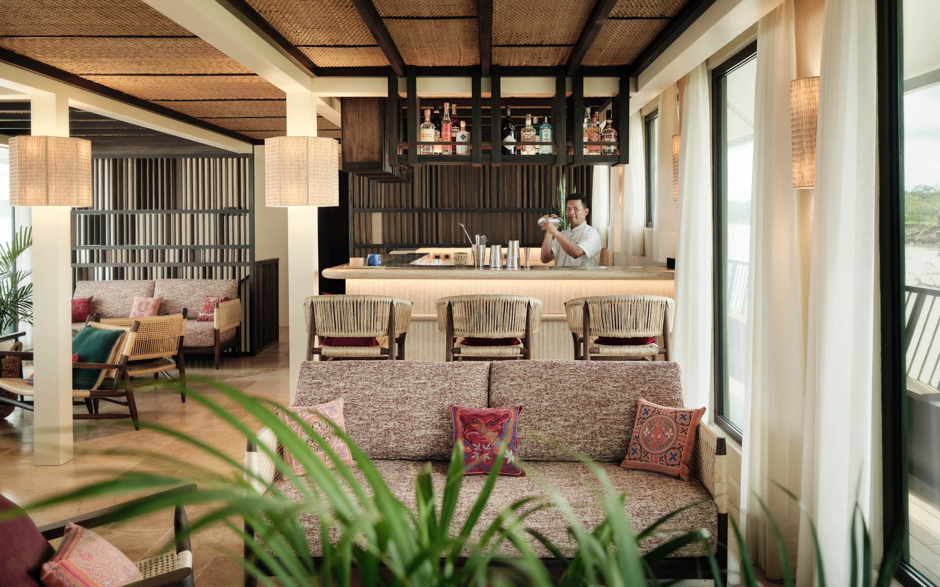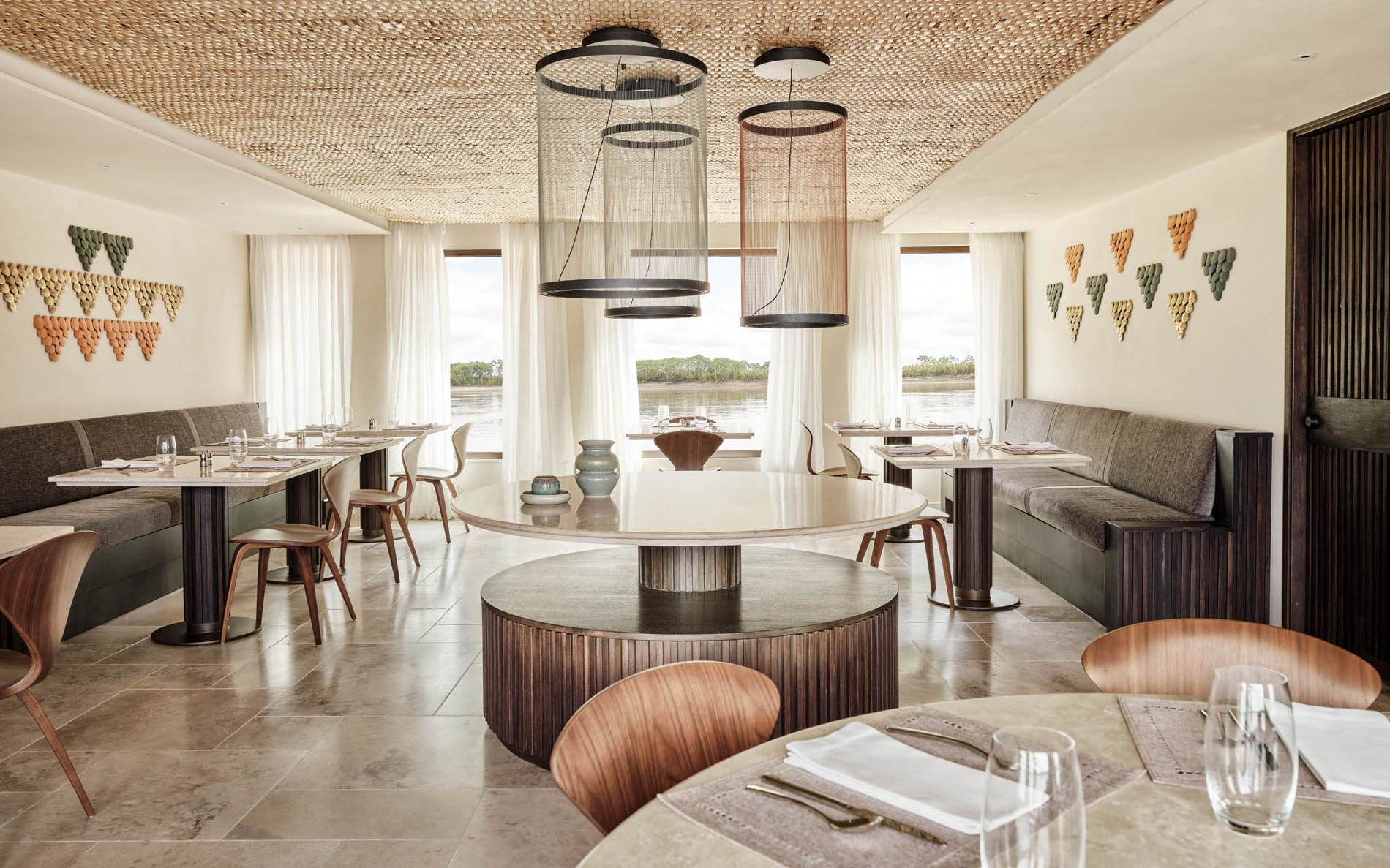 Das Sonnendeck bietet Daybeds, einen Spa-Pool und ungestörten Blick auf den Fluss. Die Lounge und das Restaurant sind offen gestaltet, mit natürlichem Licht und regionalen Materialien. Der Wellnessbereich verfügt über einen Behandlungsraum und einen Fitnessbereich mit Panoramablick.