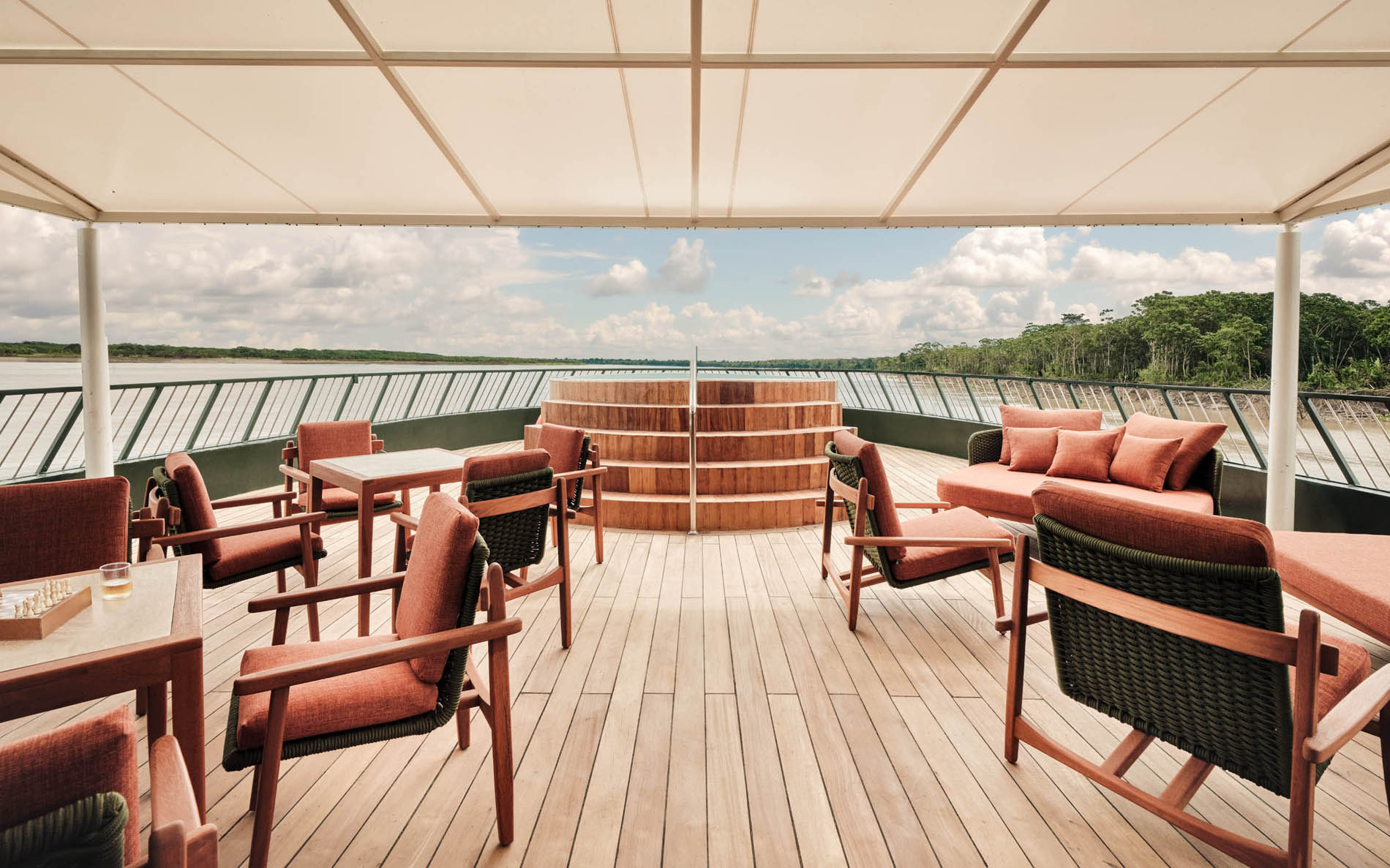 Der Spa- und Wellnessbereich auf dem Oberdeck schafft einen Rückzugsort mit außergewöhnlicher Aussicht. Sie trainieren im Fitnessraum, entspannen im Warmwasserpool oder genießen Anwendungen mit natürlichen Inhaltsstoffen aus dem Amazonasgebiet.
