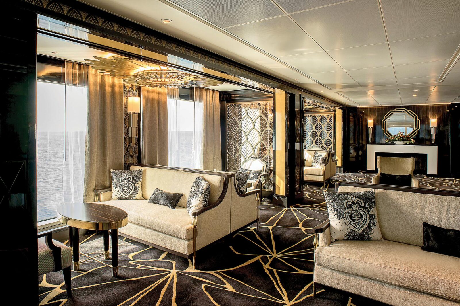 - Seven Seas Suiten – ca. 67 m² (davon 18 m² Balkon); offenes Wohn-/Schlafkonzept, Bad mit separater Wanne, Butler-Service.