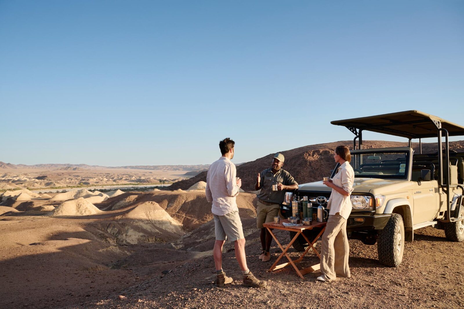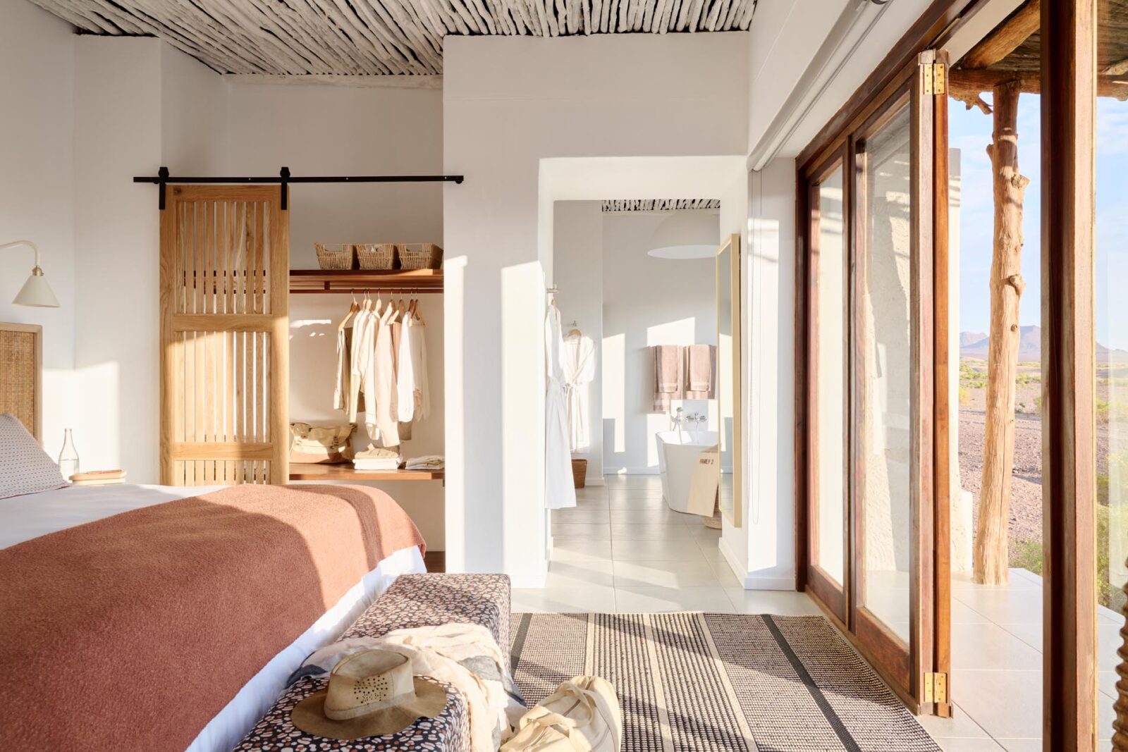 Purros liegt tief im Kaokoland im Nordwesten Namibias. Weite Ebenen, trockene Flussläufe, Akazien, Tamarisken und sandige Täler prägen diese Region. Hier leben Wüstenelefanten, Giraffen, Löwen, schwarzer Nashorn sowie die halbnomadischen Himba. Die Okahirongo Elephant Lodge – an A&K Sanctuary thront mit Panoramablick über diese einsame Landschaft. Die Suiten bieten Eleganz, Privatsphäre, Außensalas mit Tagesbetten und Rückzugsbereiche zum Lesen, Atmen, Nichtstun. Aktivitäten sind Wüstensafaris in offenen Geländewagen, Spurensuche nach Wüstenelefanten oder schwarzem Nashorn, Morgenwalks und Sundowner in kompletter Einsamkeit. Wer möchte, besucht – respektvoll begleitet – eine Himba-Gemeinschaft und erfährt mehr über Kultur, Alltag und Tradition dieser stolzen Menschen. Für Reisende, die Ursprünglichkeit suchen und dabei nicht auf Komfort verzichten möchten.
