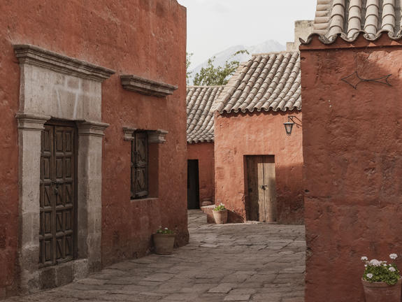 - Arequipa als weiße Stadt mit Klosterarchitektur und Blick auf hohe Vulkane